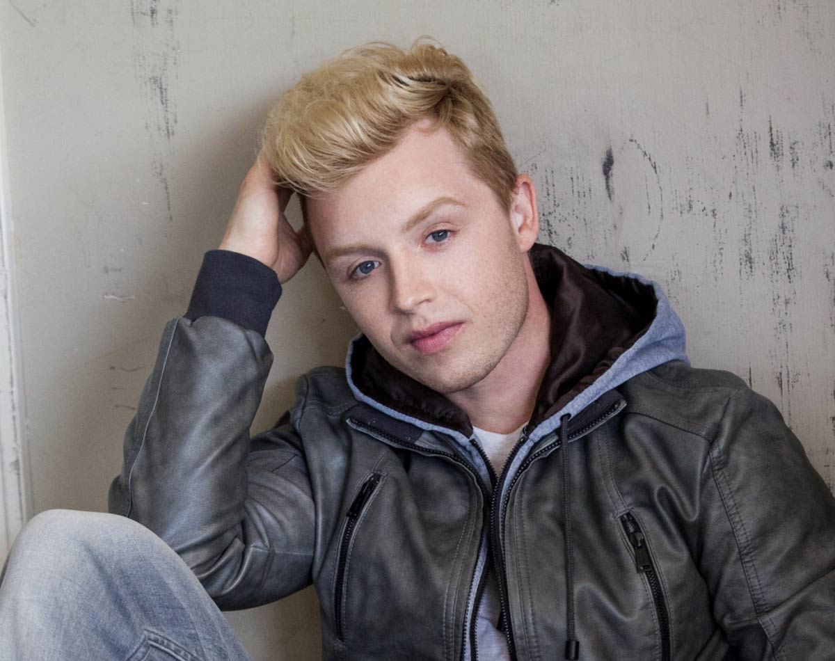 Молодой мужчина с блондинистыми волосами, сидящий и опирающийся рукой о голову. Носит кожаную куртку и футболку с капюшоном. Он позирует на фоне стены с неоднородной текстурой.