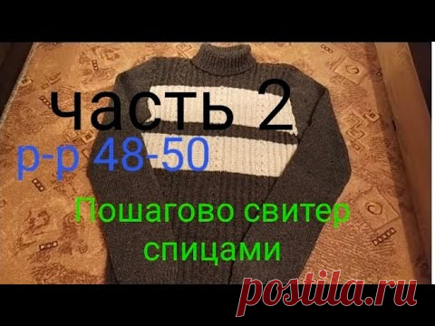 Свитер с полосатым узором, представленный на полу. Накладан текст указывает на часть 2, размеры 48-50, и что это плетеный свитер, выполненный на спицах.