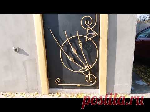 Черный металлический вход с декоративной ковкой на двери в бежевой стене