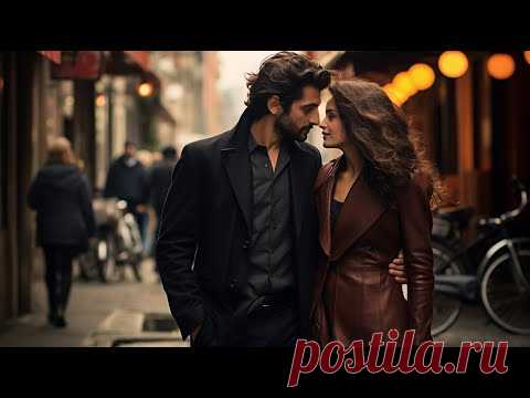 Модная пара идет по городской улице. Мужчина и женщина кажутся элегантно одетыми и находятся в тесном взаимодействии, что создает романтическую атмосферу. В фоновой части изображения видны городские элементы, такие как здания, велосипед и другие прохожие.