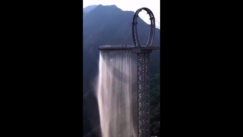 Водопад искусственного происхождения с непривычной конструкцией в виде кольца на верхней части, окруженный горным пейзажем.