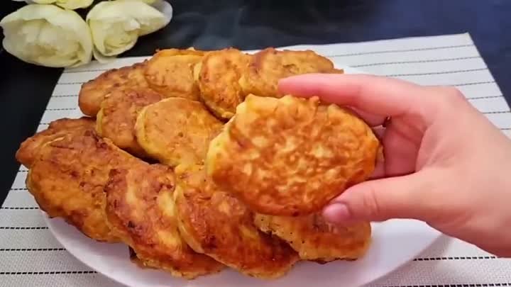 На изображении рука держит кусочек котлеты или блинчика, а на столе лежит несколько аналогичных кусочков. Это выглядит как домашняя еда, возможно какой-то вид зажаренных картофельных оладьев или кабачковых котлет.