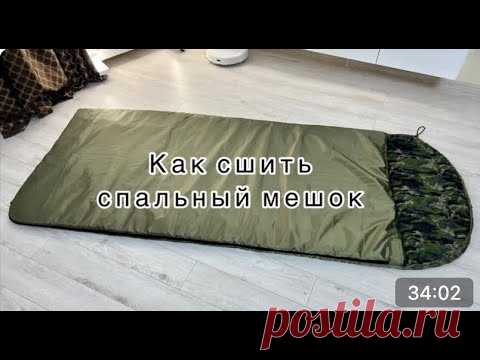 Изображение демонстрирует спальный мешок, лежащий на полу, с текстом "Как сшить спальный мешок" наверху, указывающим на видеоурок или инструкцию.