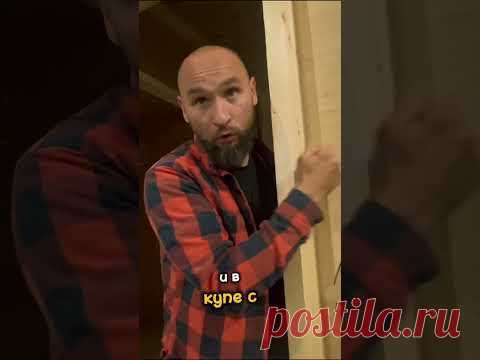 Мужчина в клетчатой рубашке и с лысиной делает ремонтные работы внутри помещения. Он кажется удивленным или застигнутым врасплох. На изображении присутствуют деревянные элементы, возможно, каркас или дверной проем.