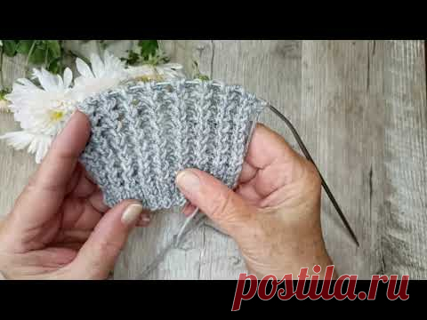 На фотографии изображены руки человека, держащие серый вязаный изделие на спицах. В углу изображения видны белые цветы, видимо, ромашки, на фоне деревянной поверхности.