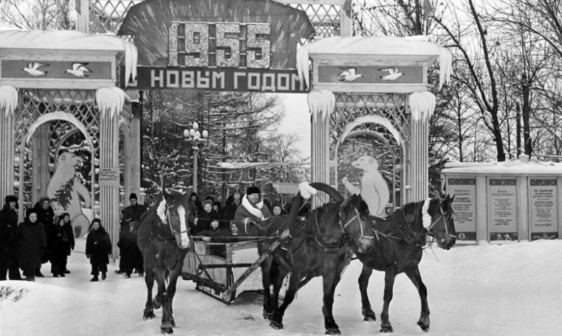 Черно-белое изображение празднования Нового года с людьми, запряженной лошадьми повозкой и аркой с надписью "1955 Новым Годом".