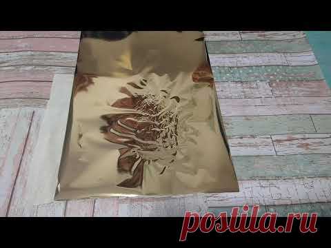 Изображение представляет собой золотистую фольгу или блестящую упаковочную бумагу, смятую в центре. Фольга лежит на поверхности с принтом под дерево.