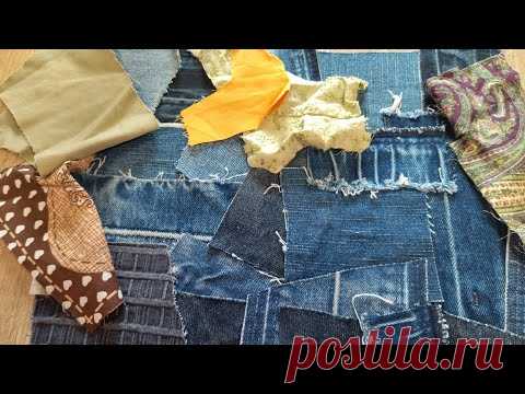 На изображении представлены различные кусочки ткани, нашитые на поверхность джинсовой ткани. Это может быть элемент квилта или процесс ремонта джинсового изделия.