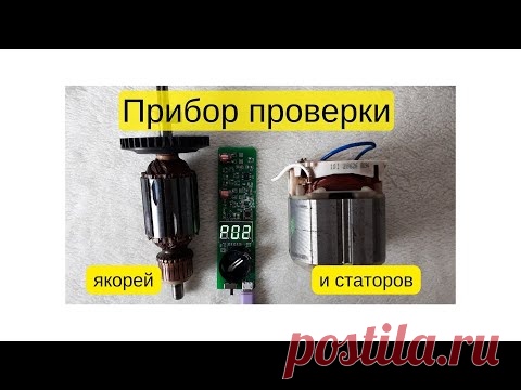 На изображении представлены электронные компоненты и устройства, в том числе прибор для проверки, ротор, печатная плата и статор. Также есть надписи, дающие информацию о том, что это устройство для проверки роторов и статоров.