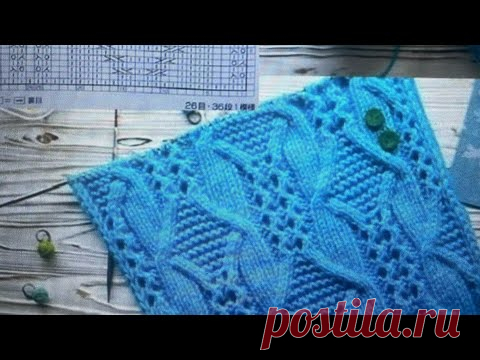 На изображении представлена синяя вязаная вещь, возможно, свитер или часть одеяла, с узорами в форме кос. Рядом видны спицы и схема вязания, а также несколько пуговиц. Фон состоит из деревянной поверхности.