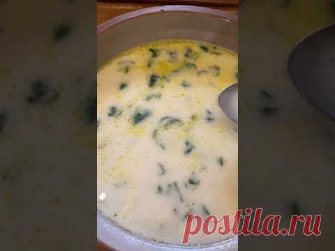 На изображении представлен суп в кастрюле. По видимому содержанию, это может быть куриный суп с вермишелью и зеленью на молочной основе.