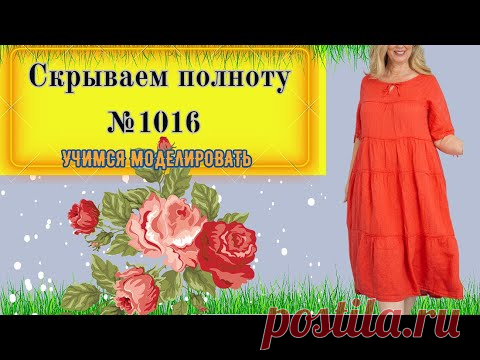На изображении представлена обложка с видео или журнала посвящённая моделированию одежды. Слева расположен текст "Скрываем полноту №1016 УЧИМСЯ МОДЕЛИРОВАТЬ", справа изображена женщина в оранжевом платье. На переднем плане нарисованы цветы, а сайт poshita.ru указан в нижней части изображения.