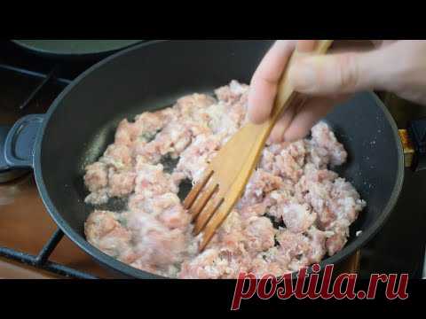 На изображении видна сковорода на плите, в которой жарится фарш. Рука держит деревянную лопатку и перемешивает фарш. Процесс приготовления пищи на кухне.