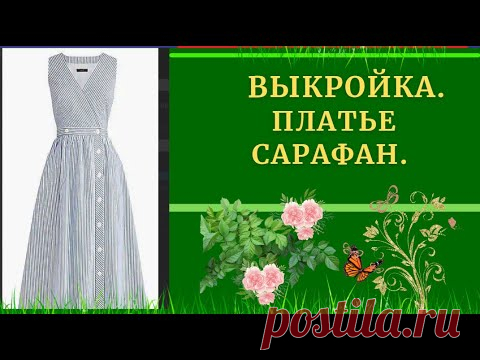 На изображении представлена схема выкройки платья сарафана, размещенная на зеленом фоне с изображениями цветов. Слова на изображении гласят "выкройка платье сарафан".
