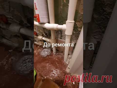На изображении видна комната до начала ремонтных работ с видимыми трубами и неотделанными стенами. На полу заметны следы строительного мусора и пятна, возможно, от ржавчины или старой краски.