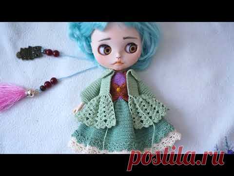 Кукла с голубыми волосами в зеленом платье, на белом фоне с украшениями.