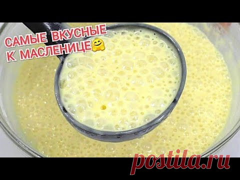 На изображении виден металлический ситечко, опущенное в жидкую смесь, вероятно, тесто или блинчиковое тесто. Вокруг ситечка видны пузырьки на поверхности смеси. В верхней части изображения находится текст на русском языке, который гласит: "САМЫЕ ВКУСНЫЕ К МАСЛЕНИЦЕ 😋", что предполагает, что смесь готовится в рамках подготовки к празднованию Масленицы.