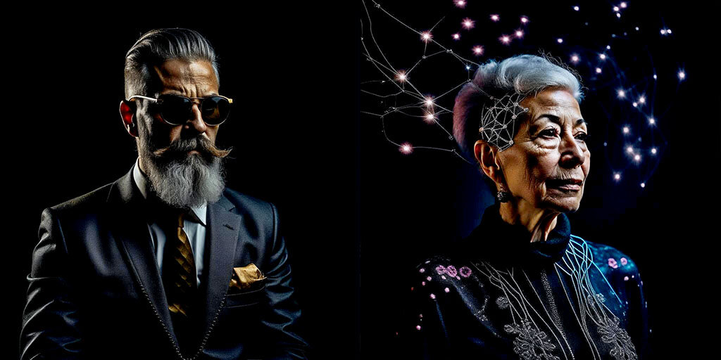 На изображении представлены два стилизованных портрета: с левой стороны мужчина с бородой в темных очках и классическом костюме, справа - пожилая женщина с укладкой в элегантной блузе. Фон для каждого портрета выполнен в темных тонах, с абстрактными световыми узорами, создающими контраст. Внизу изображения находится надпись "posila.ru".