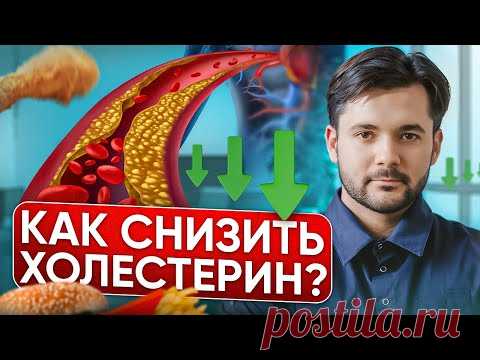 На изображении мужчина появляется на фоне иллюстрации, показывающей артерию с кровью и холестериновыми бляшками. Текст на картинке на русском языке гласит: "Как снизить холестерин?". Это похоже на обложку видео или изображение из статьи о здоровье и медицинских советах.