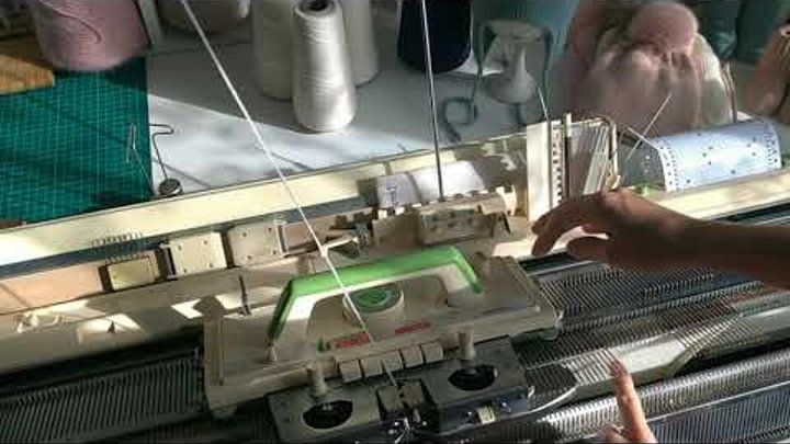 На изображении видно вязальную машину. Человек работает на машине, проводя рукой рядом с механизмом, который перемещается по направляющим. На заднем плане видны конусы с пряжей.
