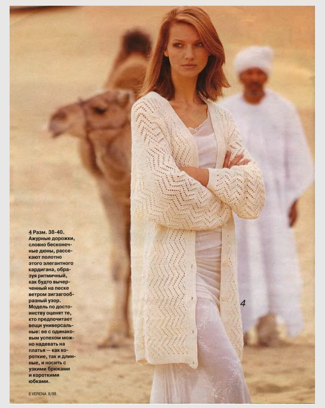 На изображении женщина в белом вязаном кардигане и белом платье позирует, стоя на песке. На заднем плане верблюд и два человека в традиционной одежде. Одна из фигур, мужчина, смотрит в сторону камеры. Сцена создает атмосферу пустыни и традиционной культуры.
