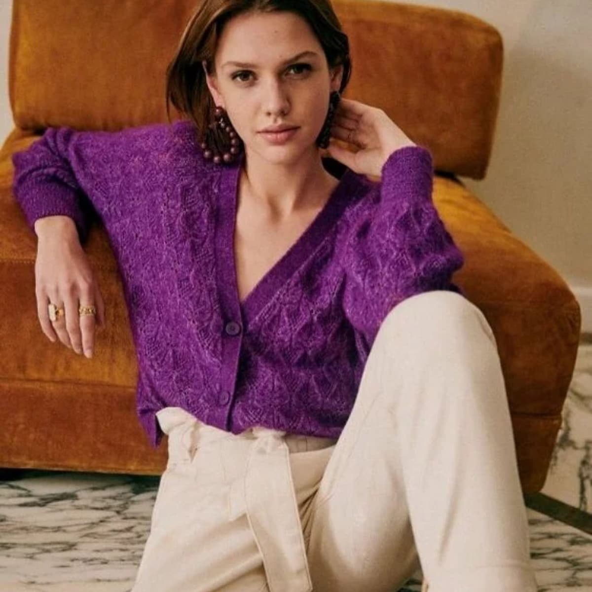 На изображении женщина в элегантном образе сидит на жёлтом диване. Она носит ярко-фиолетовый вязаный кардиган и светлые брюки на высокой талии. Её взгляд направлен в сторону камеры, и она слегка прикасается к своему уху.