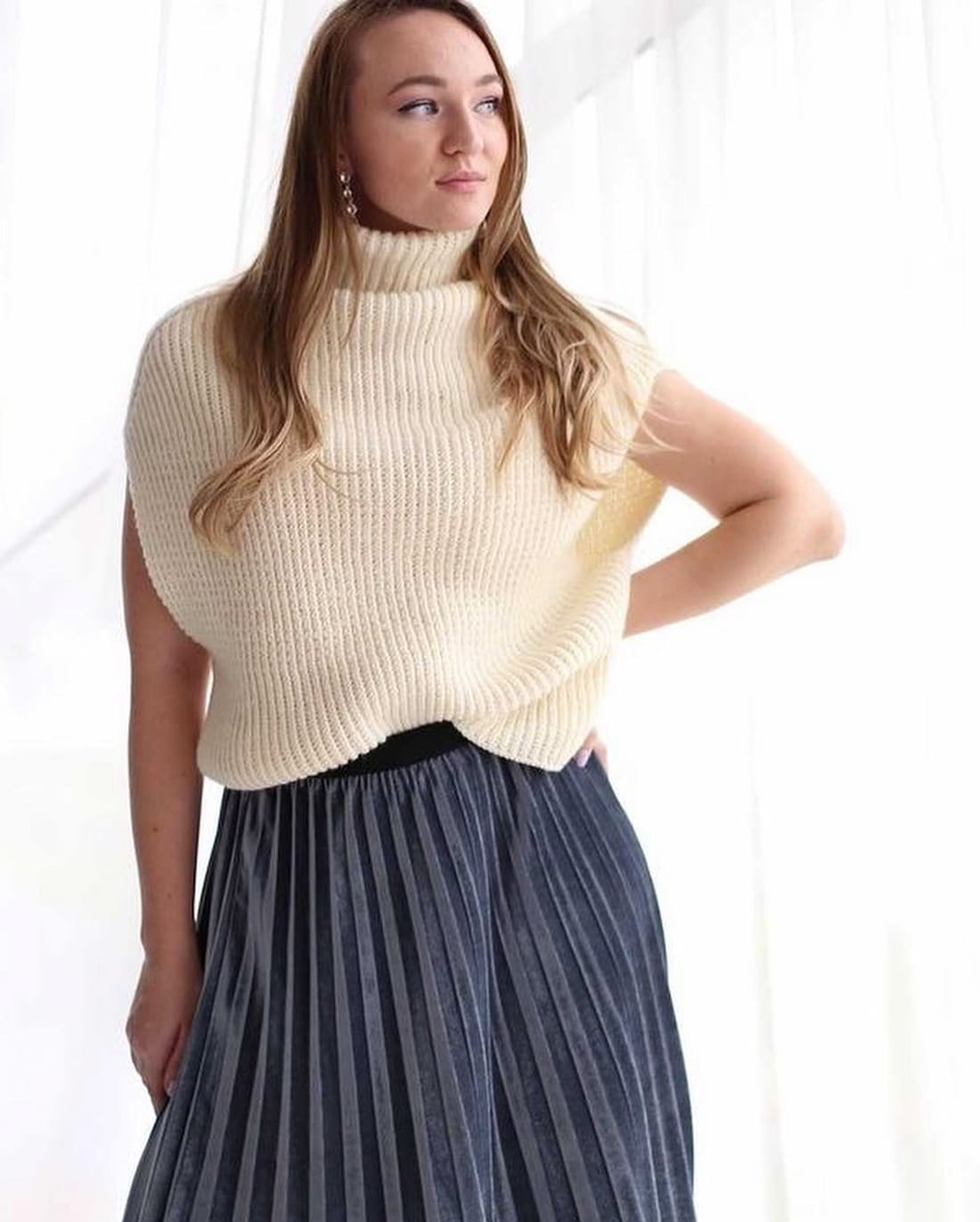 Женщина в светлом вязаном свитере без рукавов и темно-серой плиссированной юбке позирует на фоне светлых штор.