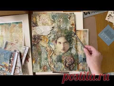На изображении рабочее место для создания художественных коллажей. В центре виден коллаж с изображением женского лица, окружённого узорами и различными декоративными элементами. Справа изображена рука человека, держащего кисть. Вокруг разбросаны другие художественные материалы и элементы коллажа.