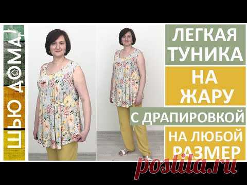 Женщина позирует в лёгкой тунике на жару с драпировкой, подходящей на любой размер. Задний план нейтральный, изображение предназначено для демонстрации одежды, возможно, для рекламы или учебного материала по шитью.