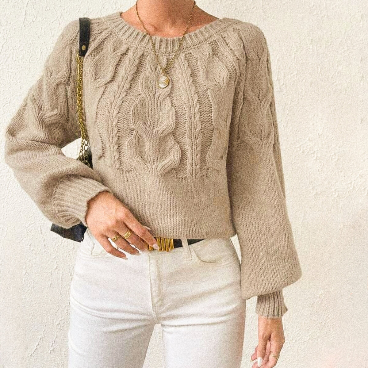 Женщина в бежевом вязаном свитере с узором и белых джинсах. Она стоит перед светлой стеной, на ней также черная сумка через плечо и золотистый ремень.