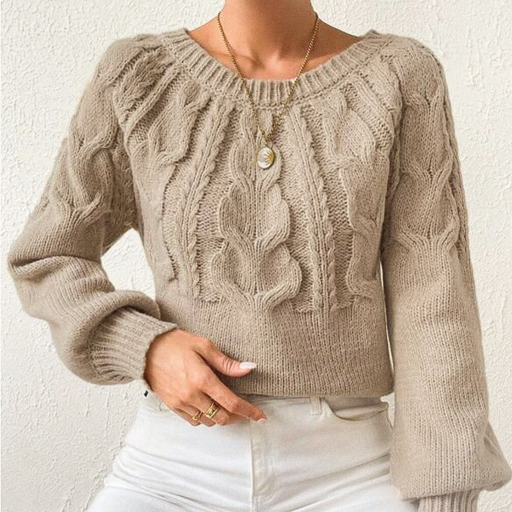 Женщина в бежевом вязаном свитере с узорами и пуговицей у шеи. Она стоит на фоне светлой стены, видна только часть тела без лица. Она носит белые брюки и золотое кольцо.