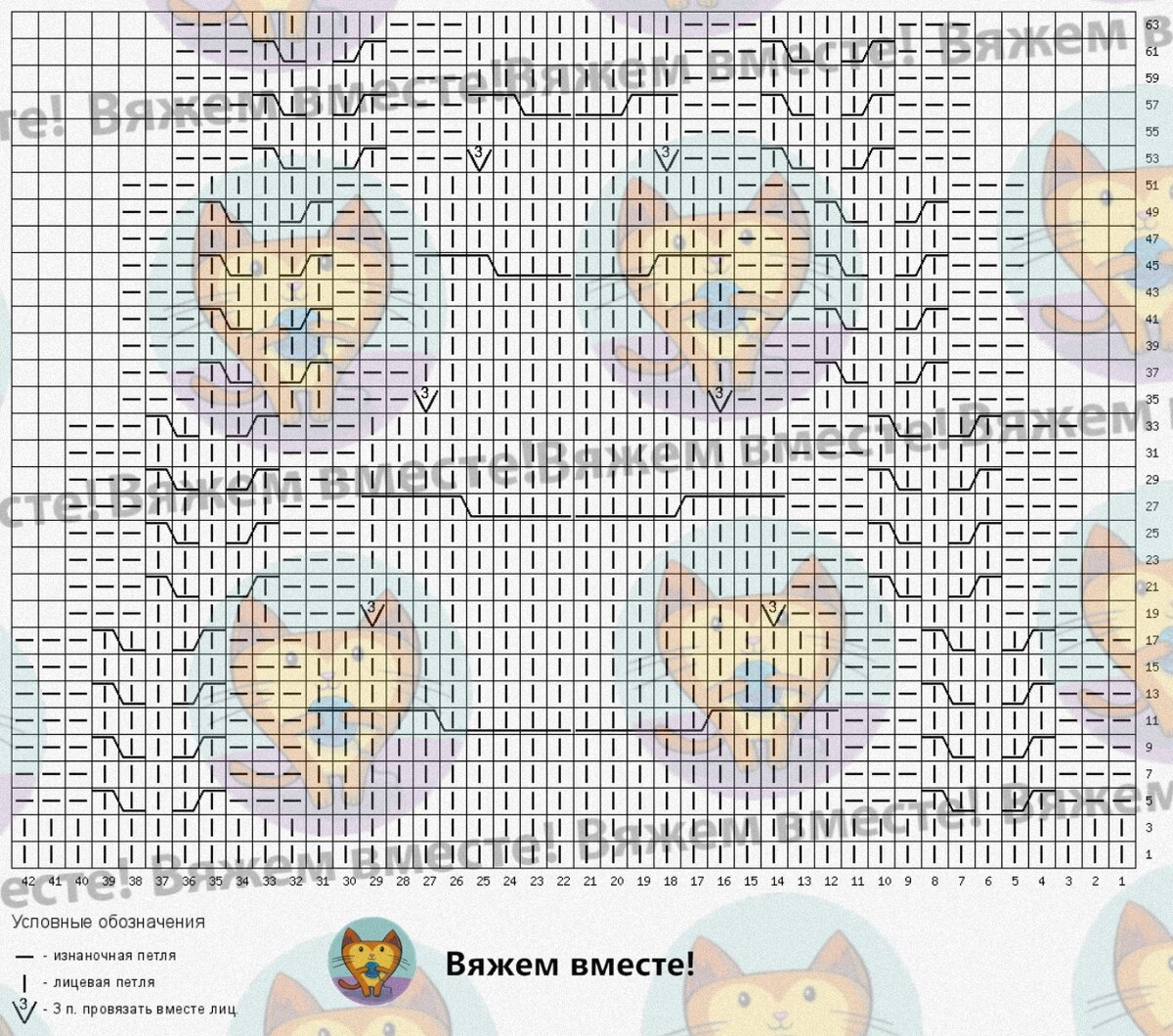 Это изображение, по-видимому, является схемой для вышивки крестом. На схеме размечены различные цвета и символы, которые указывают на соответствующие цвета ниток для вышивания. В фоне намеки на изображения кошек.