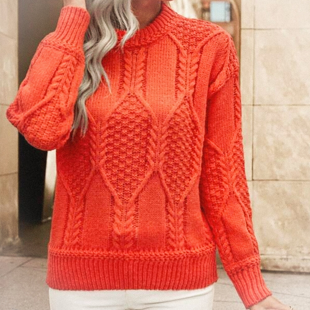 На изображении крупным планом запечатлен оранжевый свитер с красивым вязаным узором. Свитер носит человек, однако в кадр попала только часть одежды и волосы.