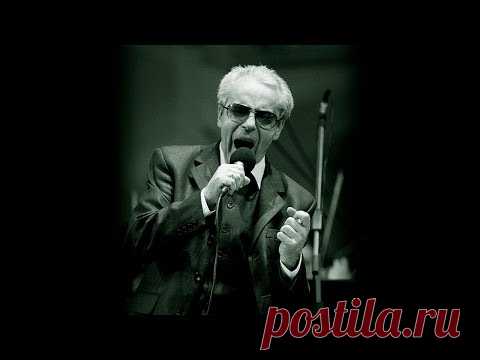 Мужчина в очках выступает с микрофоном. Фотография чёрно-белая, подсвечивает артиста на фоне затемненной сцены или аудитории.