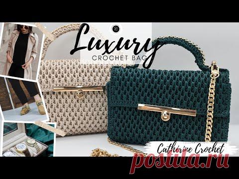 Изображение рекламного буклета, на котором представлена крючковая сумка высокого класса. На буклете есть две фотографии сумок, одна из них зеленого цвета с цепочкой как ручка, а другая бежевого цвета с мелким узором. Также присутствует надпись "Luxury Crochet Bag" и упоминание "Catherine Crochet positive.ru".