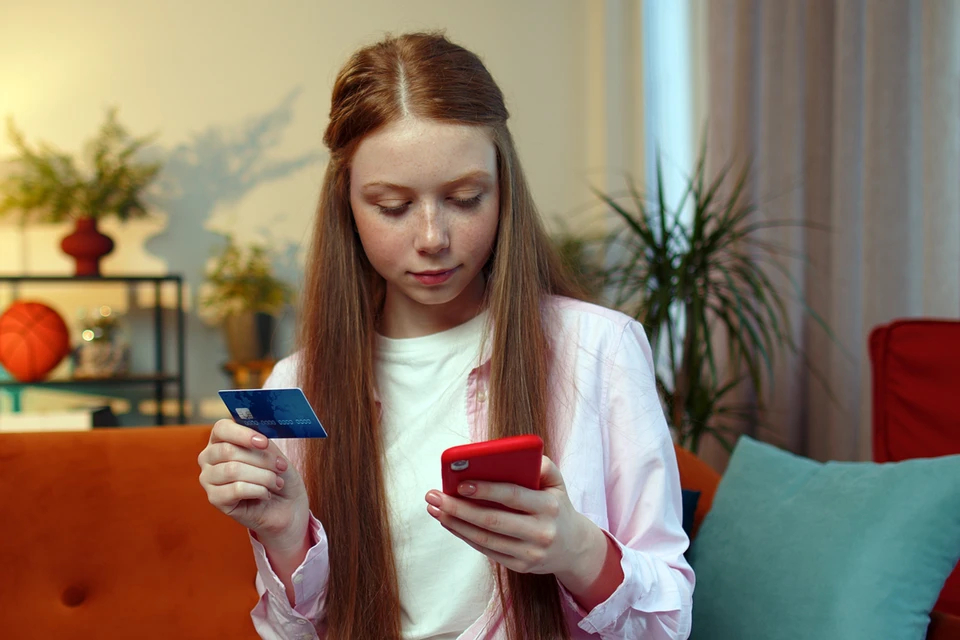 Девушка смотрит на свой смартфон и держит в руке кредитную карту. Она находится в комнате с диваном и уютной домашней обстановкой.
