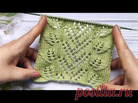 На изображении руки держат зеленый вязаный образец с узором. Образец выполнен спицами и включает открытые, перфорированные мотивы, напоминающие листья или ветви.