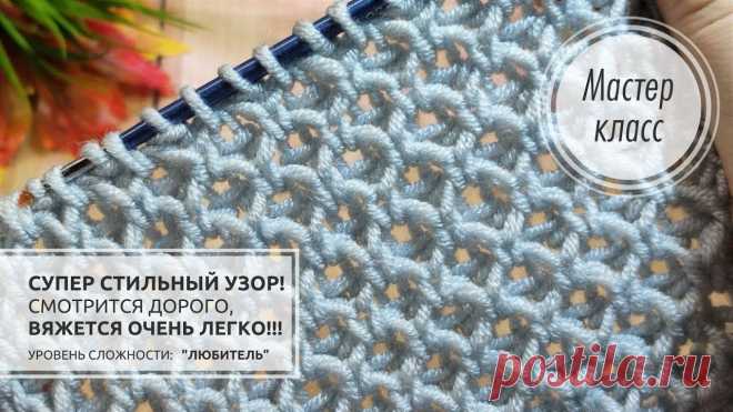 На изображении представлен фрагмент вязаной ткани синего цвета с текстом, объявляющим мастер-класс. Текст на русском языке гласит: "Супер стильный узор! Смотрится дорого, вяжется очень легко!! Уровень сложности - "любитель"". В углу изображения логотип "postila.ru".