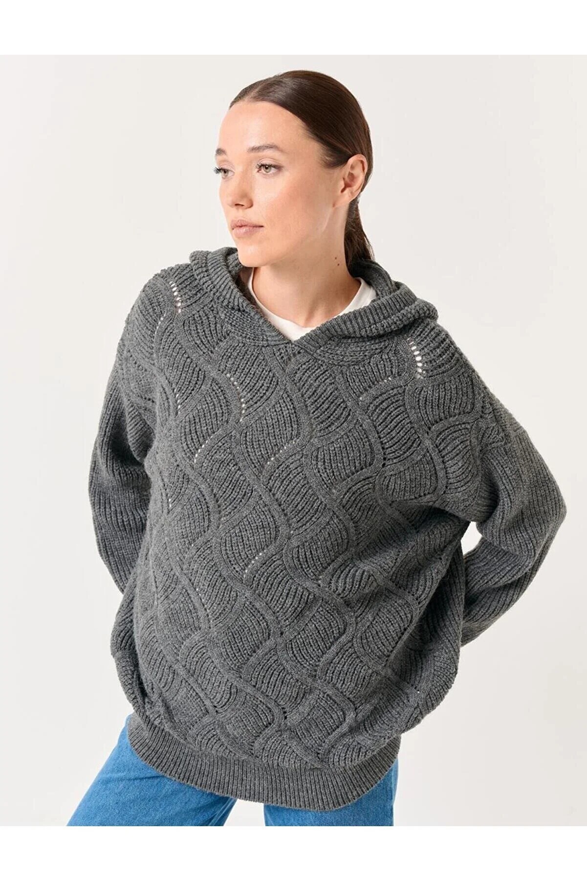 На изображении женщина с прямыми волосами в сером вязаном свитере с узором в виде кос. Она носит синие джинсы и позирует для фотографии, смотря вбок с серьезным выражением лица. Фон нейтральный.
