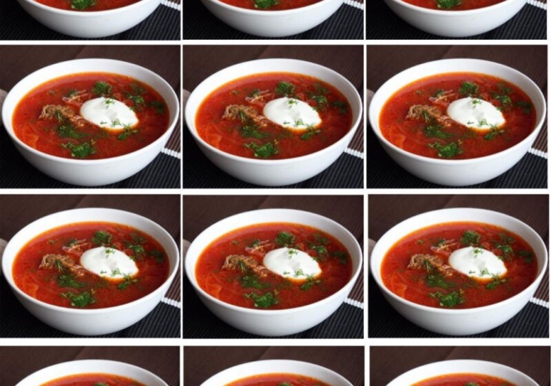 На изображении представлено несколько фотографий, на которых изображена одинаковая белая миска с красным супом, вероятно, борщом, украшенным зеленью и сметаной на поверхности.