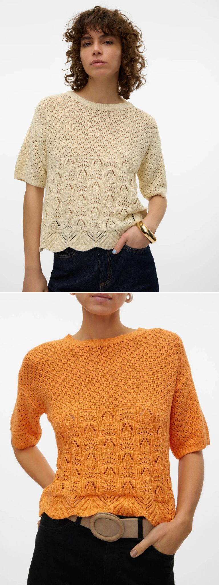 На изображении представлены две модели в вязаных свитерах. Верхняя модель носит светло-бежевый свитер с узором из отверстий, а нижняя модель носит оранжевый свитер с аналогичным узором. Обе носят джинсы. Стиль одежды указывает на повседневный или модный образ.