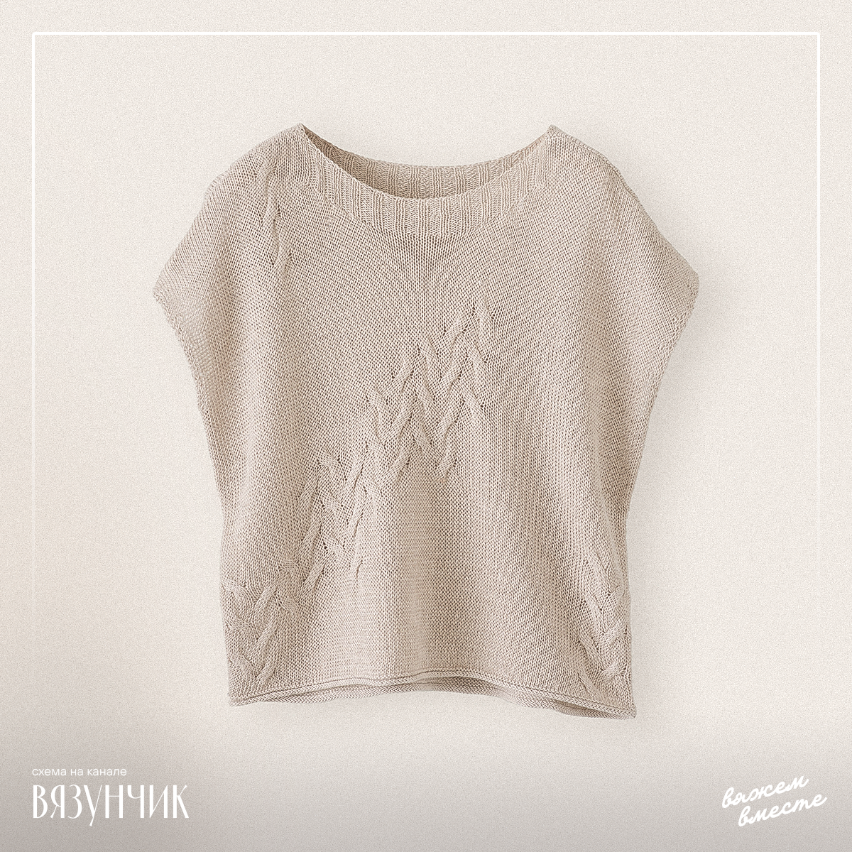 На изображении представлен светло-бежевый вязаный свитер с короткими рукавами и узором на передней части. Свитер лежит на светлом фоне.