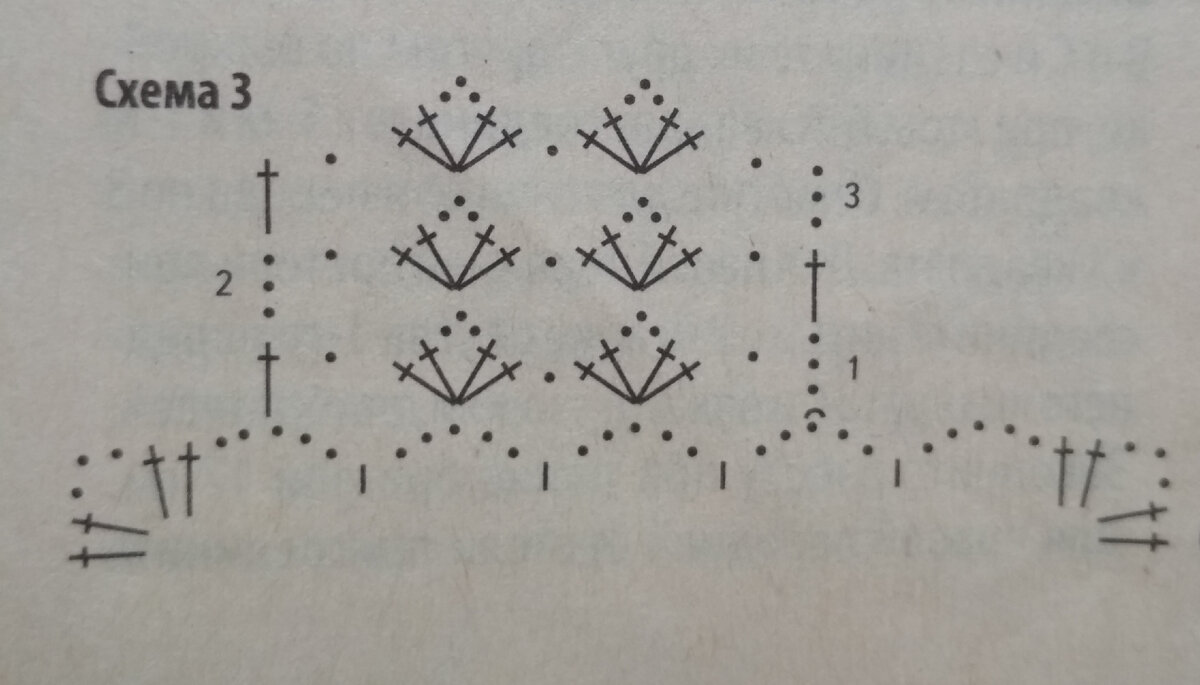 Схема для вязания, показывающая узор, состоящий из различных символов, обозначающих петли и вязальные стежки. На изображении видны линии, точки, крестики и другие знаки, используемые для описания последовательности вязания.