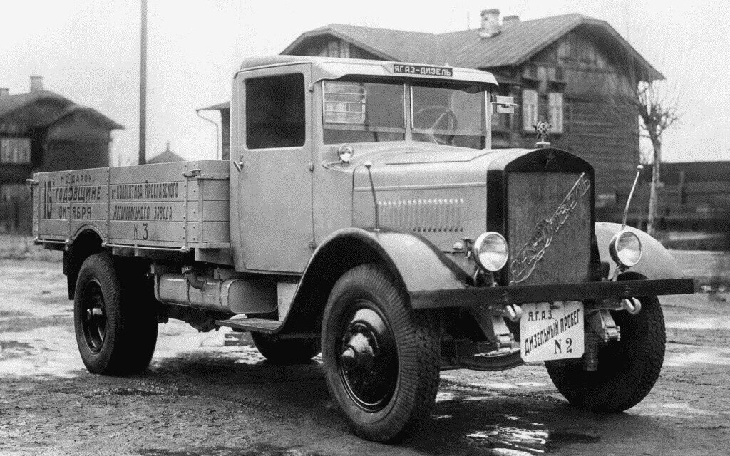 На изображении представлен старинный грузовик, чёрно-белое фото, возможно сделанное в середине 20-го века. Грузовик стоит на фоне домов, предположительно, на улице с укатанной грунтовой дорогой.