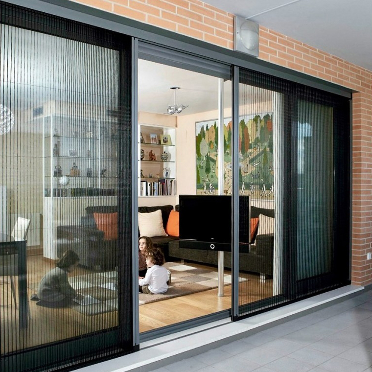На фотографии изображен современный интерьер гостиной, видимый сквозь большие стеклянные двери-раздвижки. Внутри комнаты видно телевизор, диваны и полки с книгами. На полу играет ребенок.
