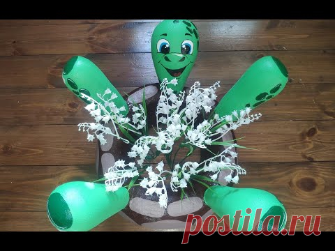 Изображение самодельного поделки в виде животного, сделанного из пластиковых бутылок зеленого цвета и других материалов на деревянном полу. У поделки имеются глаза, улыбающийся рот, и украшена она белыми цветами и листьями, прикрепленными к телу и конечностям.