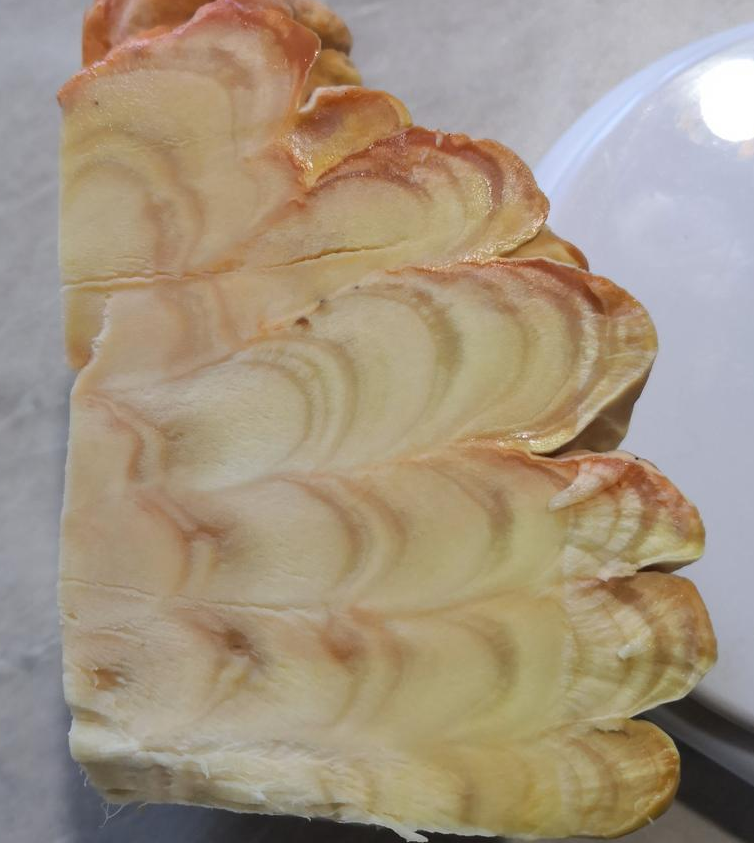 Кусок румяного хлеба со специфической текстурой, напоминающей деревянную текстуру или паттерны, расположен на поверхности рядом с тарелкой.