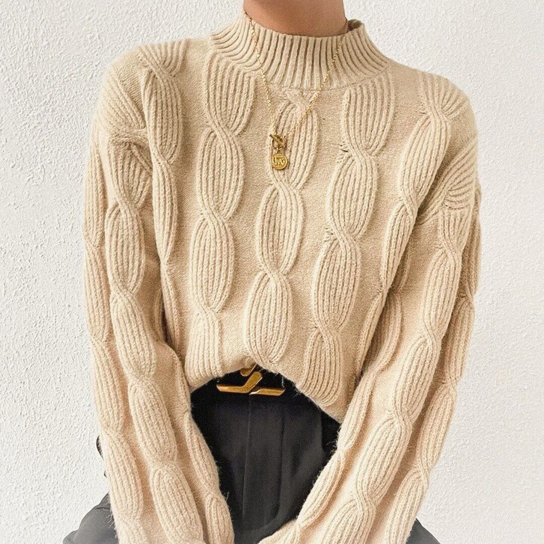 Женщина в бежевом вязаном свитере с узором в виде кос. Она стоит на нейтральном фоне, лицо не видно.