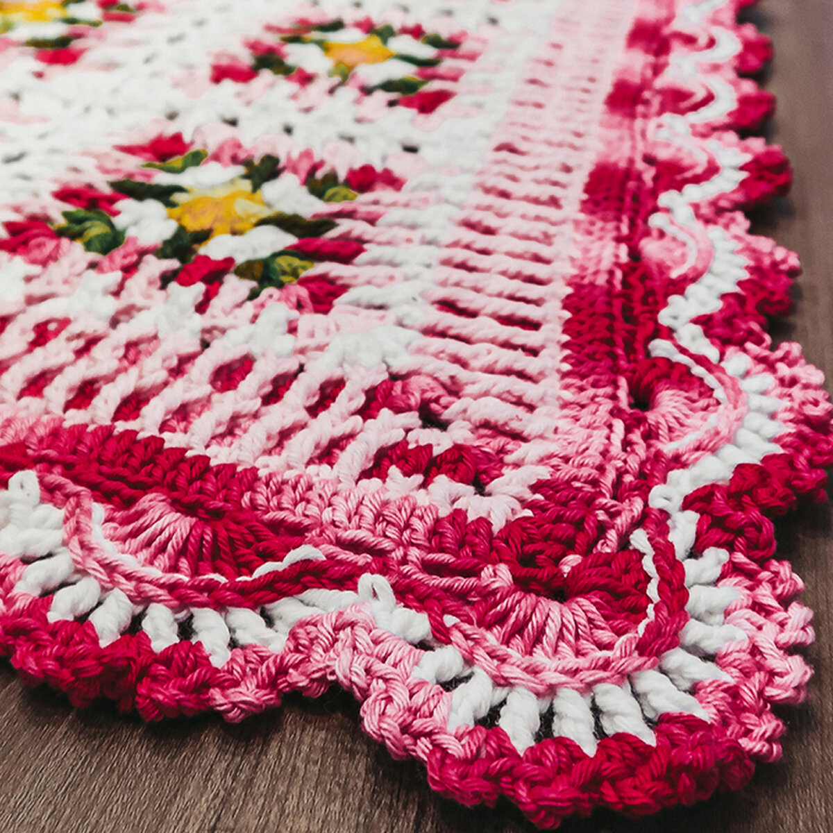 Розово-белое вязаное изделие, вероятно, плед или скатерть, с орнаментом, лежит на деревянном полу.