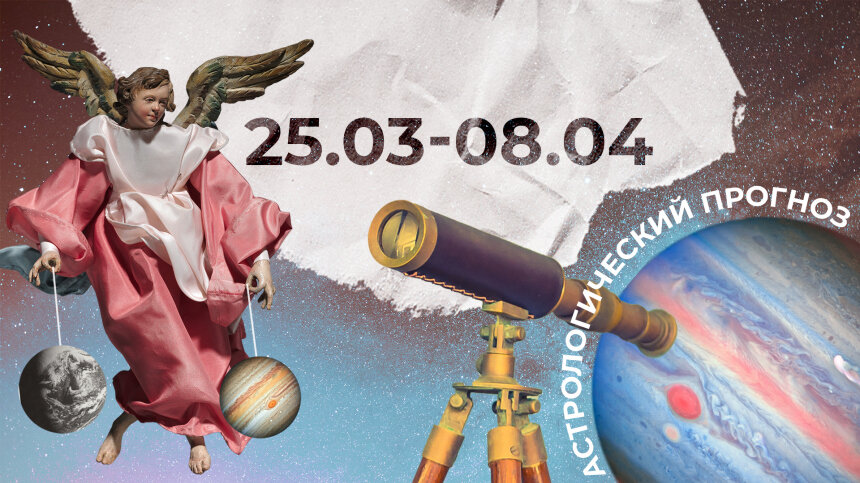На изображении представлен коллаж в стиле астрологического прогноза. Изображена фигура ангела, который парит в космосе рядом с планетами и телескопом. В верхней части нарисованы даты "25.03-08.04", а в нижней части - надпись "астрологический прогноз" и домен "posita.ru".